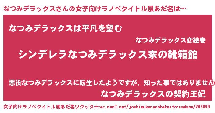 | 男性向けラノベタイトル風あだ名 | 『冴えないなつみデラックスの育てかた』 |