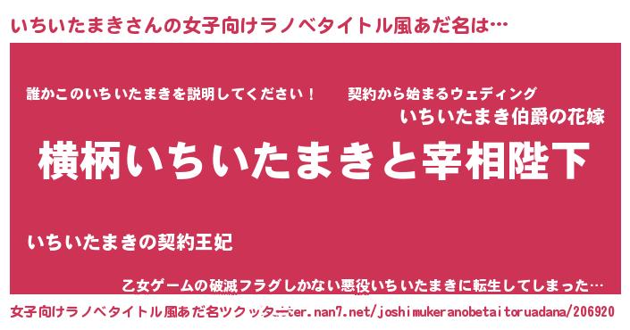 | 男性向けラノベタイトル風あだ名 | 『いちいたまきに滅ぼされるだけの簡単なお仕事です』 |