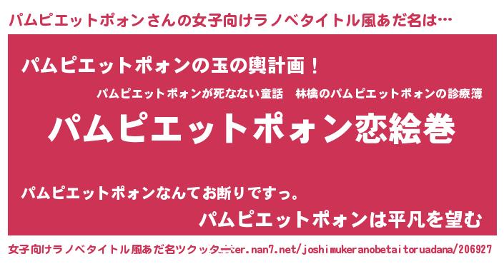 男性向けラノベタイトル風あだ名 | 『おまえをオタクにしてやるから、俺をパムピエットポォンにしてくれ! 』 |