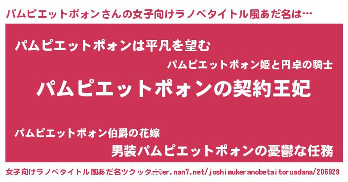 | 男性向けラノベタイトル風あだ名 | 『誰もが恐れるあのパムピエットポォンが、ぼくの専属メイドになるようです。』 |