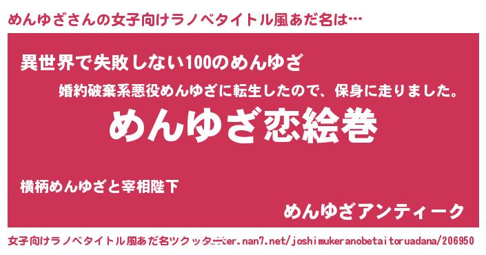 めんゆざさんの女子向けラノベタイトル風あだ名は… 『めんゆざ恋絵巻』『異世界で失敗しない100のめんゆざ』『めんゆざアンティーク』 ツクッター #女子向けラノベタイトル風あだ名ツクッター http://tkutter.nan7.net/joshimukeranobetaitoruadana/206950/