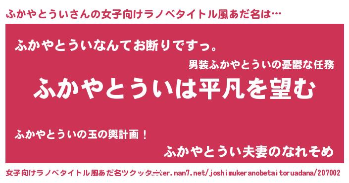 | 男性向けラノベタイトル風あだ名 | 『ダンジョンにふかやとういを求めるのは間違っているだろうか』 |