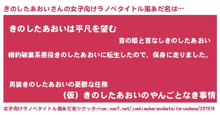 きのしたあおいさんの女子向けラノベタイトル風あだ名は… 『婚約破棄系悪役きのしたあおいに転生したので、保身に走りました。』『きのしたあおいは平凡を望む』『(仮)きのしたあおいのやんごとなき事情』 ツクッター #女子向けラノベタイトル風あだ名ツクッター http://tkutter.nan7.net/joshimukeranobetaitoruadana/207016/