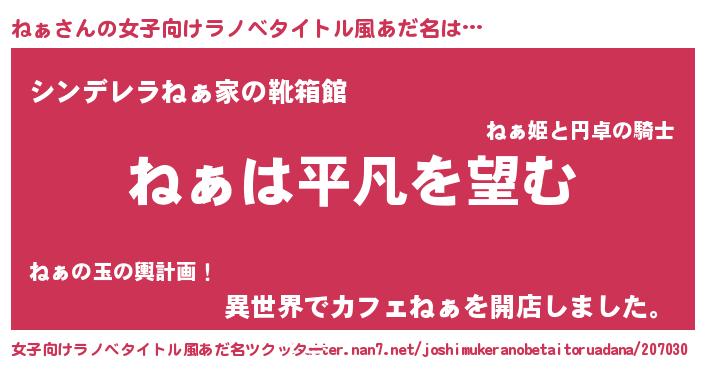男性向けラノベタイトル風あだ名 | 『ダンジョンにねぁを求めるのは間違っているだろうか』 |