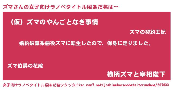 男性向けラノベタイトル風あだ名 | 『転生したらズマだった件』『ズマの憂鬱』 |