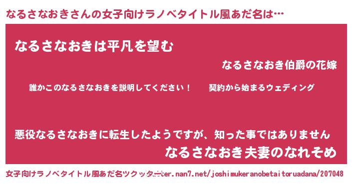 男性向けラノベタイトル風あだ名 | 『ナルサナオキアートオンライン』 |