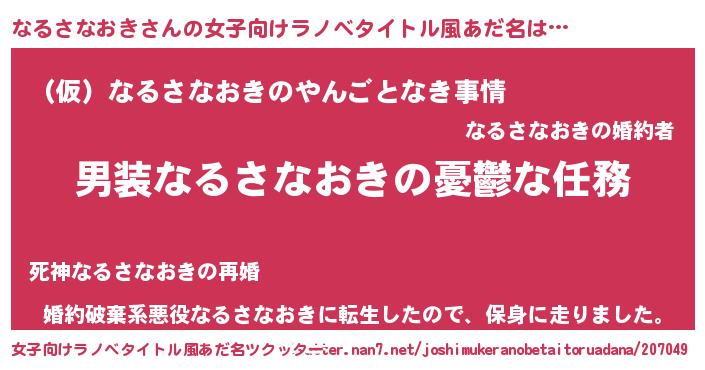 男性向けラノベタイトル風あだ名 | 『冴えないなるさなおきの育てかた』 |