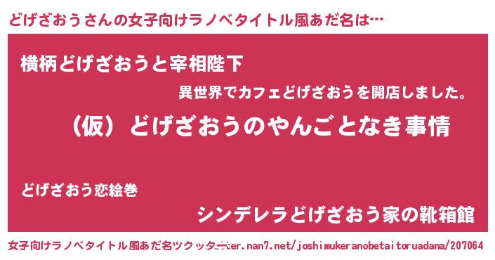 男性向けラノベタイトル風あだ名 | 『どげざおうの憂鬱』 |