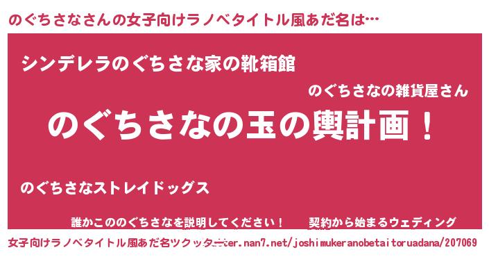 男性向けラノベタイトル風あだ名 | 『のぐちさな~年齢イコール彼女いない歴の魔法使い~』 |