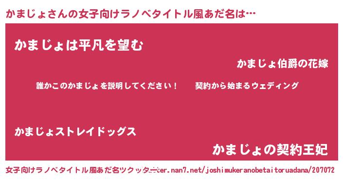 かまじょさんの女子向けラノベタイトル風あだ名は… 『誰かこのかまじょを説明してください! ~契約から始まるウェディング~』『かまじょは平凡を望む』『かまじょの契約王妃』 ツクッター #女子向けラノベタイトル風あだ名ツクッター http://tkutter.nan7.net/joshimukeranobetaitoruadana/207072/