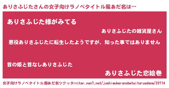 | 男性向けラノベタイトル風あだ名 | 『この素晴らしい世界にありさふじたを!』 |