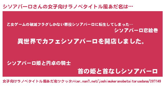 | 男性向けラノベタイトル風あだ名 | 『誰もが恐れるあのシソアバーロが、ぼくの専属メイドになるようです。』 |