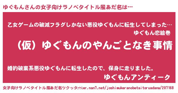 男性向けラノベタイトル風あだ名 | 『ゆぐもんの憂鬱』『魔弾の王とゆぐもん』 |