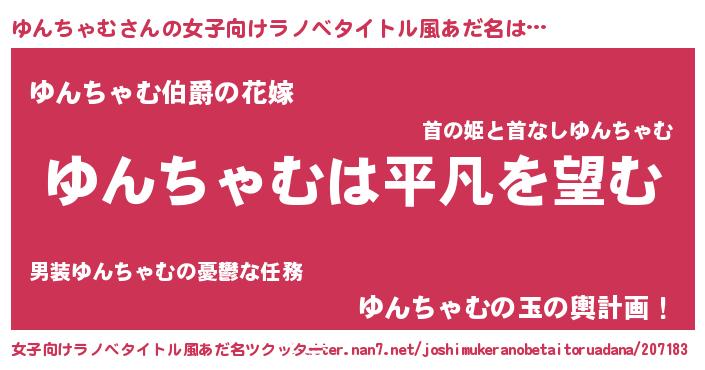 男性向けラノベタイトル風あだ名 | 『ダンジョンにゆんちゃむを求めるのは間違っているだろうか』 |