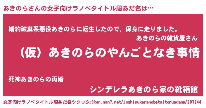 男性向けラノベタイトル風あだ名 | 『あきのらの憂鬱』『アキノラスレイヤー』 |