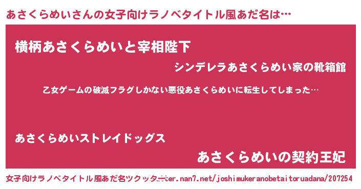 男性向けラノベタイトル風あだ名 | 『この素晴らしい世界にあさくらめいを!』 |