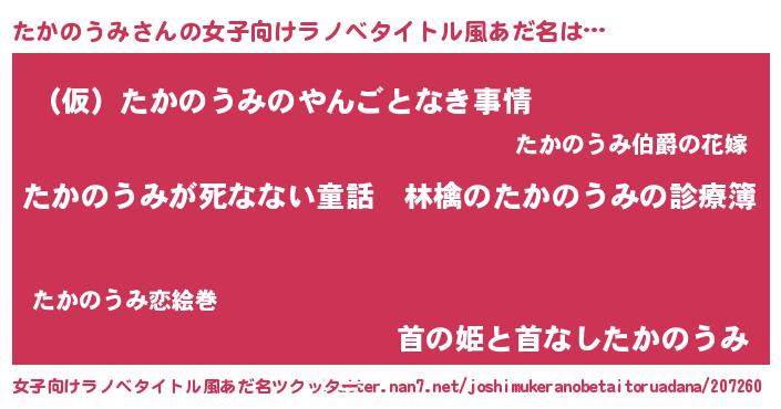 男性向けラノベタイトル風あだ名 | 『魔弾の王とたかのうみ』 |