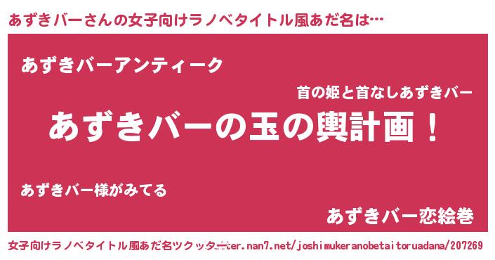 | 男性向けラノベタイトル風あだ名 | 『あずきバー~年齢イコール彼女いない歴の魔法使い~』 |