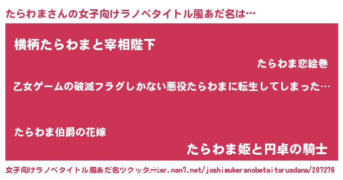 男性向けラノベタイトル風あだ名 | 『魔弾の王とたらわま』『たらわまの憂鬱』 |