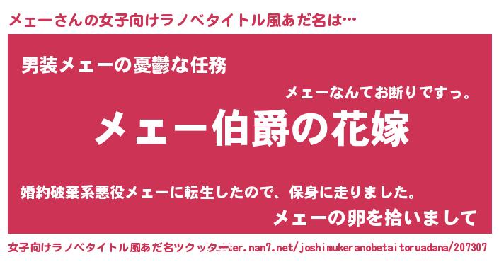 ヘコむあだ名 | 『なまこ酢』『メェっぺ』『メェもー』 |