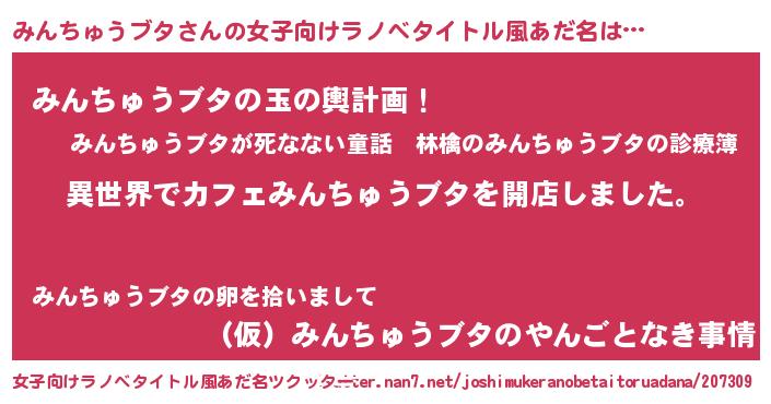 男性向けラノベタイトル風あだ名 | 『誰もが恐れるあのみんちゅうブタが、ぼくの専属メイドになるようです。』 |