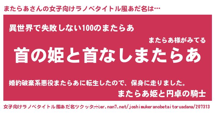 | 男性向けラノベタイトル風あだ名 | 『はたらくまたらあさま!』 |