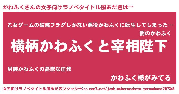 | 男性向けラノベタイトル風あだ名 | 『かわふくに滅ぼされるだけの簡単なお仕事です』 |