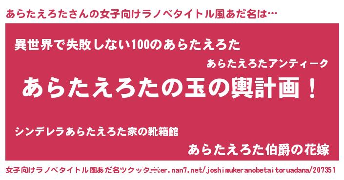 | 男性向けラノベタイトル風あだ名 | 『あらたえろた~年齢イコール彼女いない歴の魔法使い~』 |