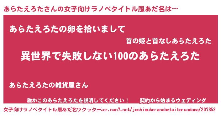 | 男性向けラノベタイトル風あだ名 | 『あらたえろたという概念が存在しない退屈な世界 』 |