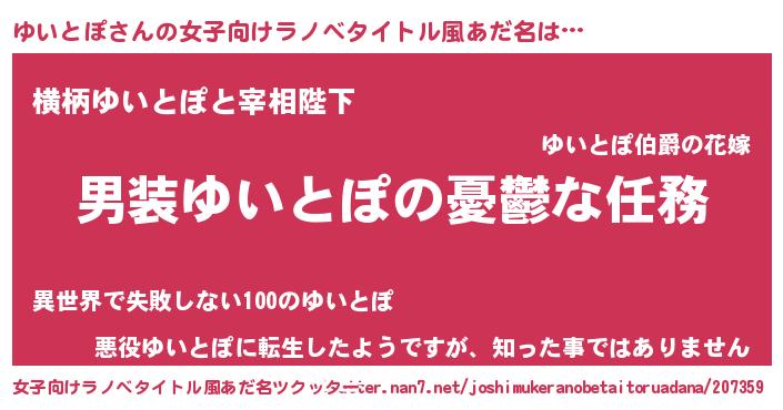 | 胡散臭い通販商品みたいなあだ名 | 『あなたにだけ特別に提供する世界で10本だけ現存している希少なブランデー…その名も「ゆいとぽ」』 |