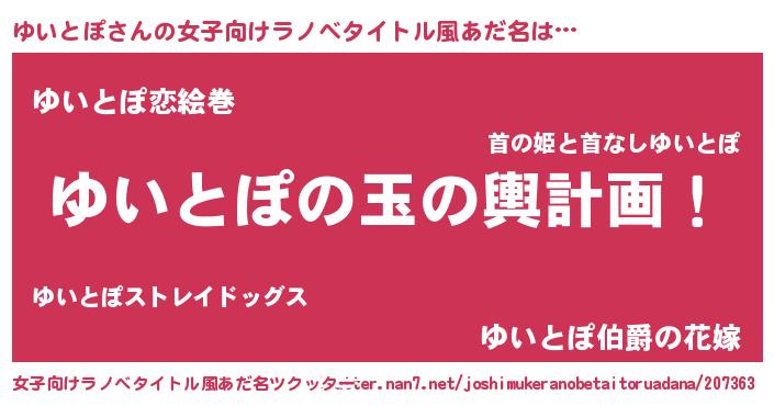 | 男性向けラノベタイトル風あだ名 | 『ゆいとぽ~年齢イコール彼女いない歴の魔法使い~』 |