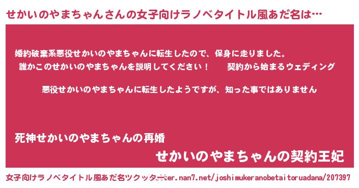 | 男性向けラノベタイトル風あだ名 | 『この素晴らしい世界にせかいのやまちゃんを!』 |