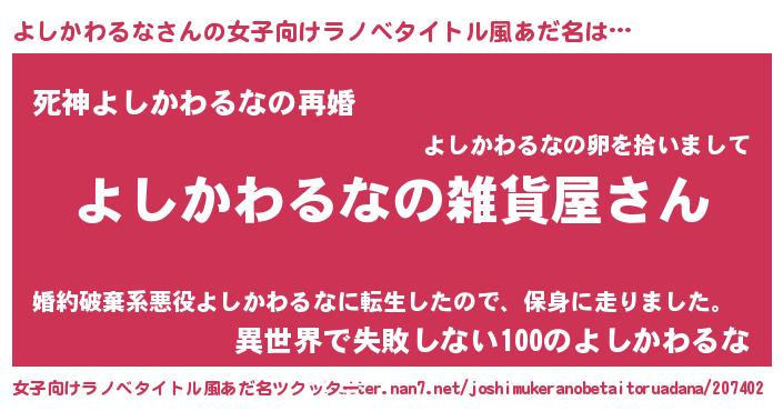 | 男性向けラノベタイトル風あだ名 | 『やはりよしかわるなの青春ラブコメはまちがっている 』 |