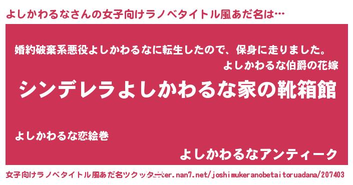 よしかわるなさんの女子向けラノベタイトル風あだ名は… 『シンデレラよしかわるな家の靴箱館』『婚約破棄系悪役よしかわるなに転生したので、保身に走りました。』『よしかわるなアンティーク』 ツクッター #女子向けラノベタイトル風あだ名ツクッター http://tkutter.nan7.net/joshimukeranobetaitoruadana/207403/