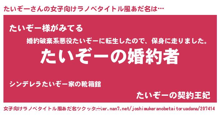 | 男性向けラノベタイトル風あだ名 | 『うちの娘の為ならば、俺はもしかしたらたいぞーも倒せるかもしれない。』 |