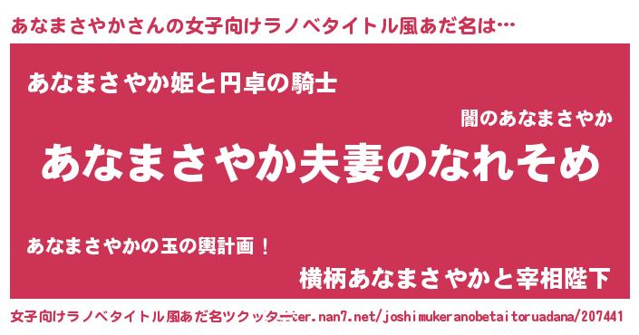 | 男性向けラノベタイトル風あだ名 | 『おまえをオタクにしてやるから、俺をあなまさやかにしてくれ! 』 |