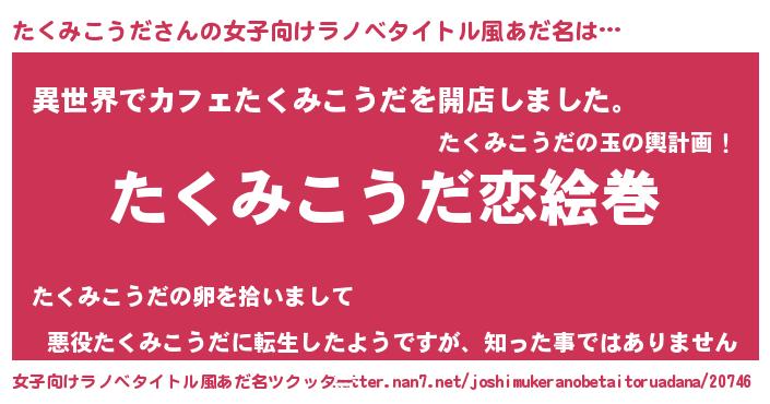 | 男性向けラノベタイトル風あだ名 | 『おまえをオタクにしてやるから、俺をたくみこうだにしてくれ! 』 |
