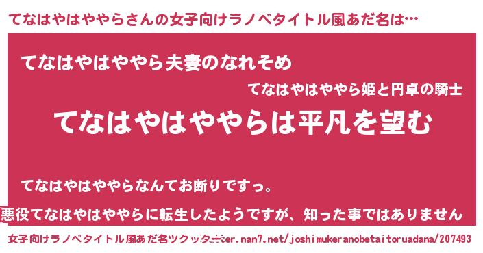 てなはやはややらさんの女子向けラノベタイトル風あだ名は… 『てなはやはややらは平凡を望む』『てなはやはややら夫妻のなれそめ』『悪役てなはやはややらに転生したようですが、知った事ではありません』 ツクッター #女子向けラノベタイトル風あだ名ツクッター http://tkutter.nan7.net/joshimukeranobetaitoruadana/207493/