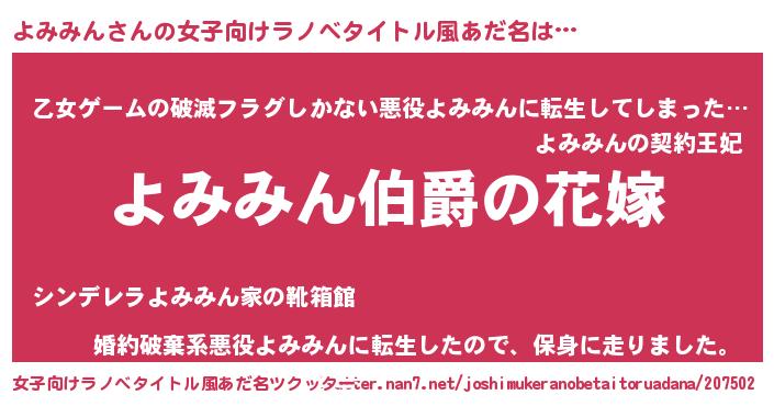 | 男性向けラノベタイトル風あだ名 | 『やはりよみみんの青春ラブコメはまちがっている 』 |