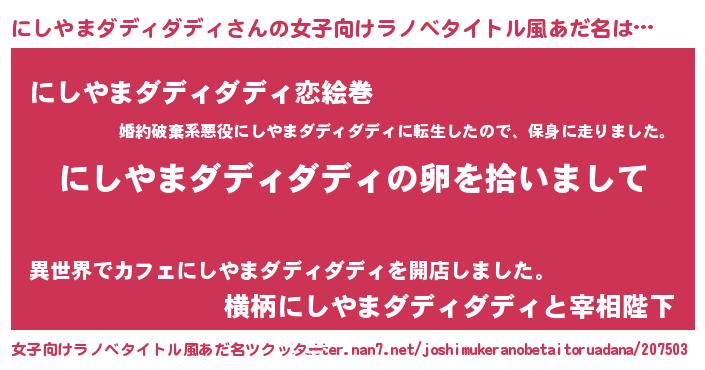 | 男性向けラノベタイトル風あだ名 | 『ダンジョンににしやまダディダディを求めるのは間違っているだろうか』 |
