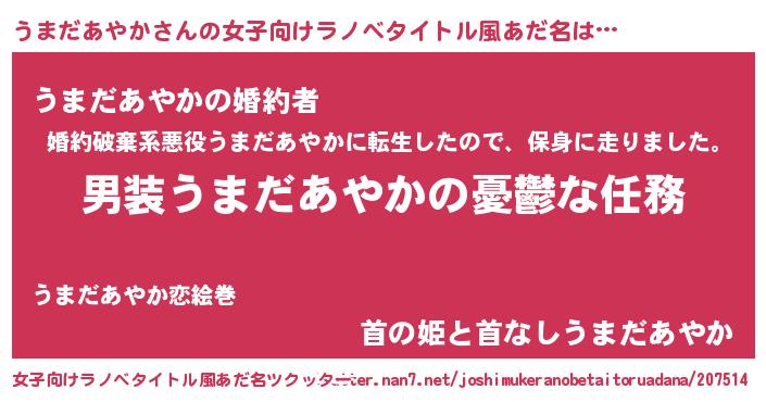 | 男性向けラノベタイトル風あだ名 | 『うちのうまだあやかが世界を掌握している!』 |