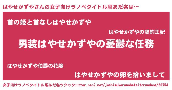 | 男性向けラノベタイトル風あだ名 | 『うちのはやせかずやが世界を掌握している!』 |