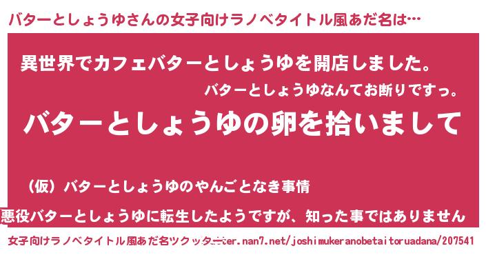 バターとしょうゆさんの女子向けラノベタイトル風あだ名は… 『バターとしょうゆの卵を拾いまして』『異世界でカフェバターとしょうゆを開店しました。』『悪役バターとしょうゆに転生したようですが、知った事ではありません』 ツクッター #女子向けラノベタイトル風あだ名ツクッター http://tkutter.nan7.net/joshimukeranobetaitoruadana/207541/