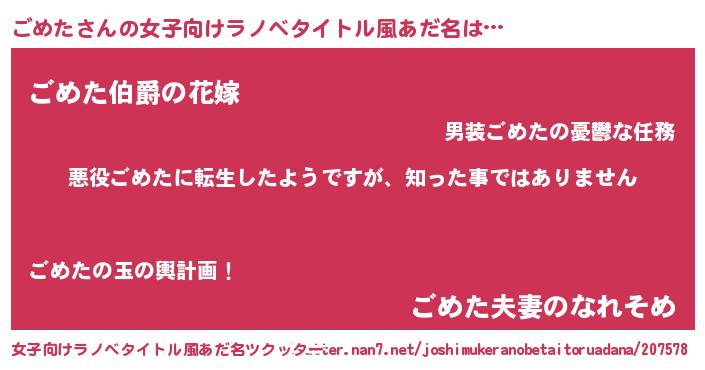 | 男性向けラノベタイトル風あだ名 | 『この素晴らしい世界にごめたを!』 |