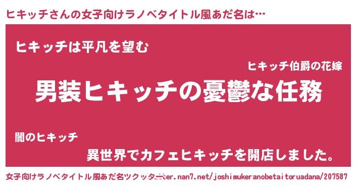 | 男性向けラノベタイトル風あだ名 | 『うちのヒキッチが世界を掌握している!』 |