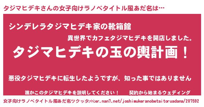 | 男性向けラノベタイトル風あだ名 | 『タジマヒデキ~年齢イコール彼女いない歴の魔法使い~』 |