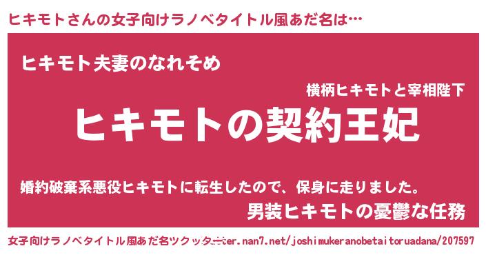 | 男性向けラノベタイトル風あだ名 | 『誰もが恐れるあのヒキモトが、ぼくの専属メイドになるようです。』 |