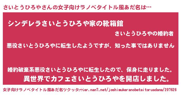 さいとうひろやさんの女子向けラノベタイトル風あだ名は… 『悪役さいとうひろやに転生したようですが、知った事ではありません』『シンデレラさいとうひろや家の靴箱館』『異世界でカフェさいとうひろやを開店しました。』 ツクッター #女子向けラノベタイトル風あだ名ツクッター http://tkutter.nan7.net/joshimukeranobetaitoruadana/207626/