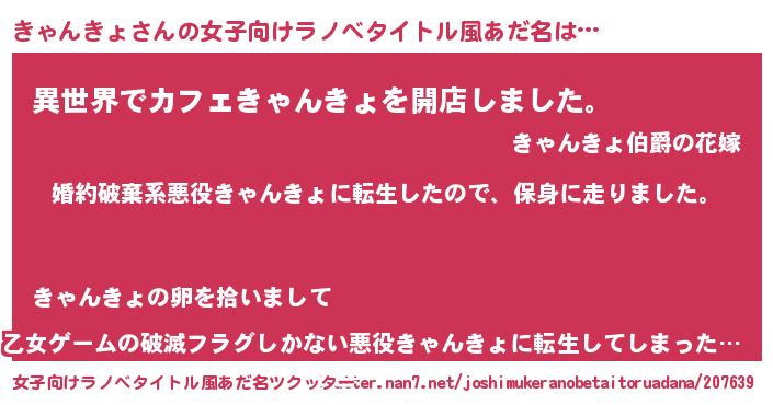 | 男性向けラノベタイトル風あだ名 | 『キャンキョスレイヤー』 |