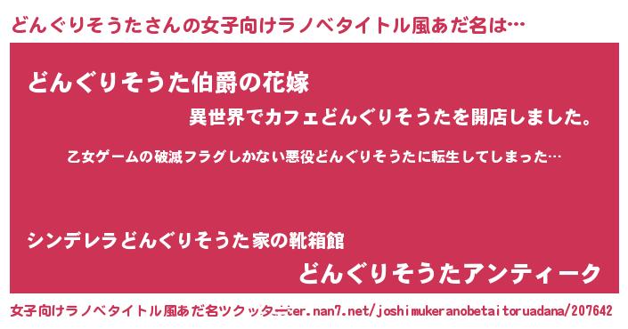 | 男性向けラノベタイトル風あだ名 | 『この素晴らしい世界にどんぐりそうたを!』 |